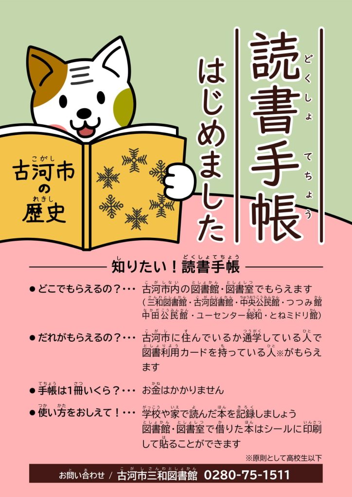 古河市では、子どもの読書意欲を高めるとともに、本に親しむ習慣を身に付ける取り組みとして、読んだ本を記録できる「読書手帳」を配布しています。図書館・図書室で借りている本の書名などをシールにプリントして手帳に貼ったり、自由に手書きすることもできます。あなただけのステキな手帳を作りましょう♪